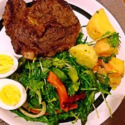 牛排、海盐、黑胡椒、橄榄油。