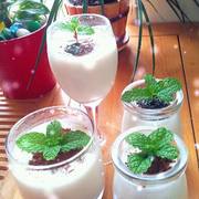 鲜牛奶、酸奶、细白砂糖、可可粉、黑芝麻粉、干净玻璃杯、新摘的薄荷叶。