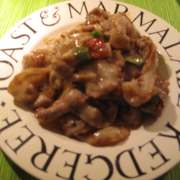 猪肉片、青红椒、蒜、水淀粉、香油、沙茶酱、生抽。
