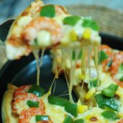 面粉、牛奶、盐、砂糖、干酵母、黄油、鲜虾、马苏里拉奶酪、青椒、玉米粒、自制披萨酱。