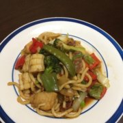 乌冬面、海鲜杂烩、蔬菜杂烩、洋葱、辣椒、盐、鸡精、老抽、生抽、蚝油、料酒、橄榄油。