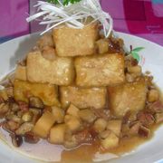 北豆腐、五花肉、香菇、笋、生粉、葱、蒜、姜、甜面酱、香油、黄酒。