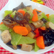 胡萝卜、木耳、莴苣、香菇、丘比沙拉汁焙煎芝麻口味、油、丘比沙拉汁日式口味。