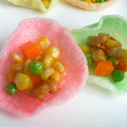 玉米棒、里脊肉、鲜豌豆、虾片、淀粉、姜、植物油、椒盐、香油、味极鲜。