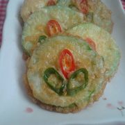 西葫芦、鸡蛋、干面粉、青椒、红椒、白芝麻、盐、油、香油、酱油、糖、葱末、蒜末。