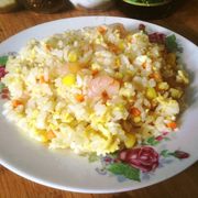 熟米饭、玉米粒、胡萝卜、虾仁、洋葱、盐、鸡精、蚝油、糖。