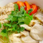面条、香菇贡丸、蕃茄、香菜、花生油、盐、酱油。