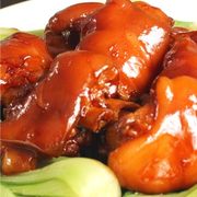 猪肘、油菜、小葱、姜、料酒、盐、冰糖、老抽、油、水。