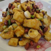山药、熟花生米、干辣椒、葱姜蒜、水淀粉、花椒、盐、白糖、鸡精、醋、辣椒油。