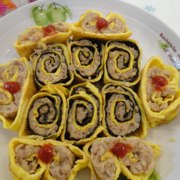 猪肉馅、鸡蛋、淀粉、盐、葱姜水、生抽、料酒、鸡精、香油、海苔。