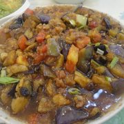 茄子、猪肉馅、葱、姜、蒜、盐、鸡精、生抽、甜面酱、糖、淀粉、西红柿、胡椒粉、豆豉、蚝油。