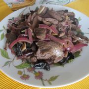 鹿肉、洋葱、木耳、辣椒、蒜瓣、盐、生抽、糖、孜然。