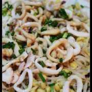 鱿鱼、绿豆芽、葱、姜、油、盐、生抽。