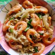 面条、新鲜虾、葱花、番茄、白菜叶、韭菜、煎蛋、油、盐、姜丝、酱油。