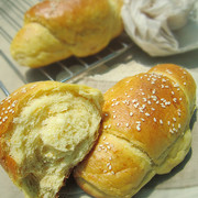 南瓜、鸡蛋、面粉、酵母粉、奶油、盐、糖、水半杯、芝麻、香肠。