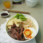 鸡胸肉、青椒、香菇、淀粉、豆瓣酱、咸鸭蛋、盐、油、面条。