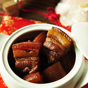 带皮五花肉、生姜、油、料酒、李锦记秘制红烧汁。
