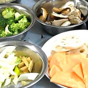 西兰花、鱼丸、虾丸、莴笋、五法肉、香菜、香菇、海带、莲藕、鱿鱼卷、毛肚、鹌鹑蛋、大葱、姜、蒜、麻椒、灯笼椒。