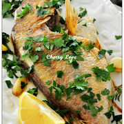 snapper 或其它鱼、柠檬、欧芹 parsley、蒜头、盐、橄榄油。