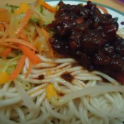切面、五花肉、胡萝卜、黄瓜、彩椒、豆芽、花生米、白芝麻、豆瓣酱、甜面酱、冰糖、八角、花椒、盐、葱、淀粉、鸡精、老抽、香油。