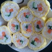 江米饭、黄瓜、胡萝卜、菠菜、香肠、鸡蛋、白芝麻。
