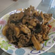 草鸡、香菇、洋葱、大蒜、姜、红辣椒、八角、茴香、李锦记红烧汁、生抽、酱油、糖、葱、白糖、料酒。