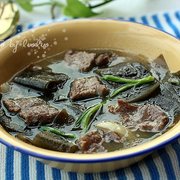 海带、牛肉、盐、生抽、料酒、生粉、姜、香醋、鸡精、蒜、葱。