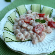 红虾仁、黄瓜、小番茄、盐、料酒、生粉、白糖、白醋、油、沙拉汁。
