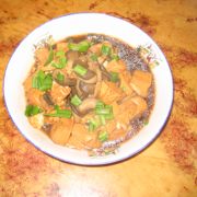 豆腐、肉丁、蚕豆酱、葱、盐、胡椒、淀粉。