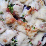 紫薯、豆渣、培根、青豆、西兰花、淡奶油、马苏里拉奶酪、牛至叶。