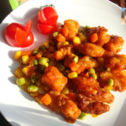 三文鱼、什锦蔬菜粒、面粉、鸡蛋、香酥炸料、蕃茄酱、盐、糖、白醋、水淀粉。