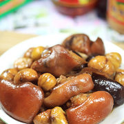 猪蹄、板栗、水发香菇、姜、蒜头、生抽、盐、料酒、糖、小茴香、八角。