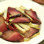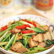 五花肉、芹菜、蒜苗、红尖椒、盐、鸡精、生抽。