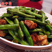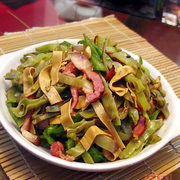 扁豆、千张、湖南腊肉、尖椒、蒜、盐、生抽、鸡精。