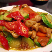 西葫芦、鸡脯肉、胡萝卜、红椒、姜、蒜、胡椒粉、生抽、盐。
