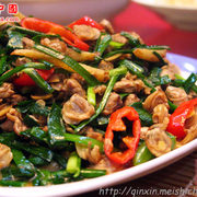 蚬肉、韭菜、青尖椒、红尖椒、姜、蒜、料酒、生抽、盐、鸡精、胡椒粉。