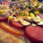 自发粉、橄榄油、火腿肠、盐、糖、牛油、洋葱、番茄、尖椒、甜玉米粒、口蘑、马苏里拉奶酪。