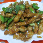 猪里脊肉、大青椒、大葱白、姜、淀粉、精盐、味精、生抽、老抽、白糖、香醋、植物油、蚝油、料酒、白胡椒粉。