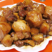 猪五花肉、芋头粉条、白糖、大料、桂皮、白芷、草果、豆蔻、精盐、红烧酱油、料酒、蚝油、葱、香菜叶、味精、姜。