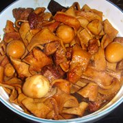 鸡腿一个、土豆一个、栗子若干、盐、、生抽、老抽、糖、葱、蒜、辣椒丝。