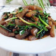 猪腰子、香葱、油、盐、姜、小红椒、生抽、老抽、味精、淀粉。