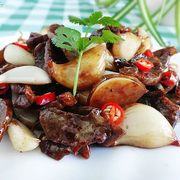 鸡胗、泡大蒜、油、盐、葱、姜、蒜、小米辣、酱油、鸡精、味精、料酒、花椒粉。