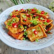 豆腐、番茄酱、油、盐、酸子姜、葱、酱油、鸡精、小红椒。