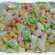 苹果、香蕉、草莓、生菜、玉米粒、丘比特沙拉酱。
