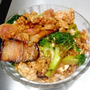 大米、酱肉、香肠、青菜、西兰花、鸡蛋、生抽、老抽、麻油、白糖、油。