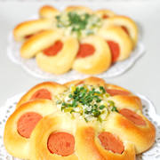 金像高筋面粉、细砂糖、盐、奶粉、干酵母、鸡蛋、水、黄油、装饰、绿葱叶碎、沙拉酱、盐、黑胡椒。