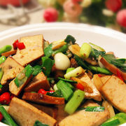 豆腐干、青蒜苗、大蒜、红辣椒、盐、鸡精。