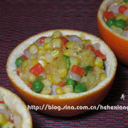 橙子、玉米粒、胡萝卜、青豆仁、荸荠、葱、姜、盐、水淀粉、糖。
