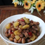 花生米、猪肉、香干、土豆、油、糖、辣椒、料酒、老抽、味精、豆瓣辣酱。