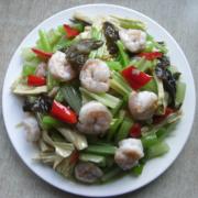 虾仁、芹菜、干腐竹、鲜青辣椒、木耳、鲜红辣椒、三合油、味精、盐、醋、白糖。
